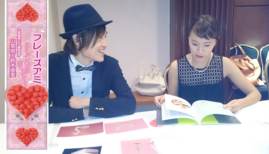 今年15周年イヤーを迎えている鈴木亜美さんが「やまなし食の大使」に任命!最近はフードアナリストの資格を取ったりレストランの料理をプロデュースしたりなど食の方面でも活躍しています。今回、美肌、美容のために15周年の「1・5」(いち・ご)とかけてイチゴをフルーツ王国山梨で栽培し始めたことから任命が実現し、これをきっかけに自身がプロデュースするイチゴスイーツ「フレーズアミ」の発売が決定しました。フランス語でフレーズ=いちご、アミ=友達といちご栽培を続ける、鈴木亜美プロデュースぴったりのネーミングとなりました。