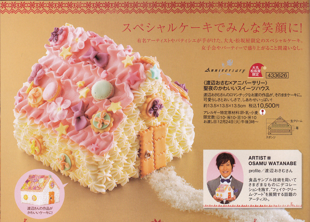 渡辺おさむのロマンチックなお家の作品が、そのままケーキに。可愛らしさとおいしさで、しあわせいっぱい!大丸松坂屋心斎橋店、梅田店、京都店、神戸店、名古屋松坂屋にて予約、お渡し可能です。